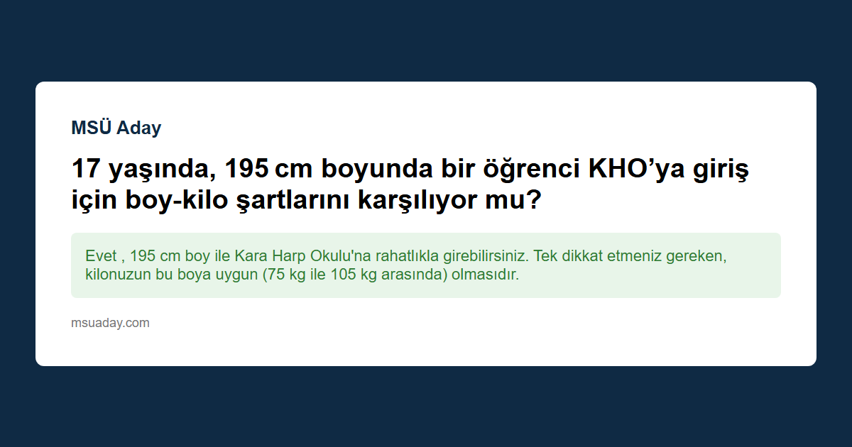 Yeni Kural: Artık 210 cm'ye kadar olan adaylar kabul ediliyor. Sadece Hava Harp Okulu (Pilotluk) için kokpit sığış problemi nedeniyle 190-195 cm üzeri riskli olabilir ve "Uçucu Olamaz" raporu verilebilir; ancak bu durumda bile KHO hakkınız yanmaz.