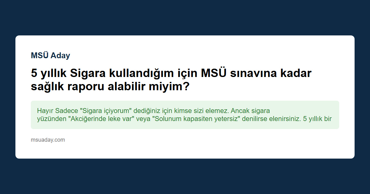 Kısa cevap: Hayır Sadece "Sigara içiyorum" dediğiniz için kimse sizi elemez. Ancak sigara yüzünden "Akciğerinde leke var" veya "Solunum kapasiten yetersiz" denilirse elenirsiniz. 5 yıllık bir kullanım genç yaşta (2005-2007 doğumlu olduğunuzu varsayarsak) genellikle kalıcı bir engel yaratmaz ama performansınızı ciddi oranda düşürür.