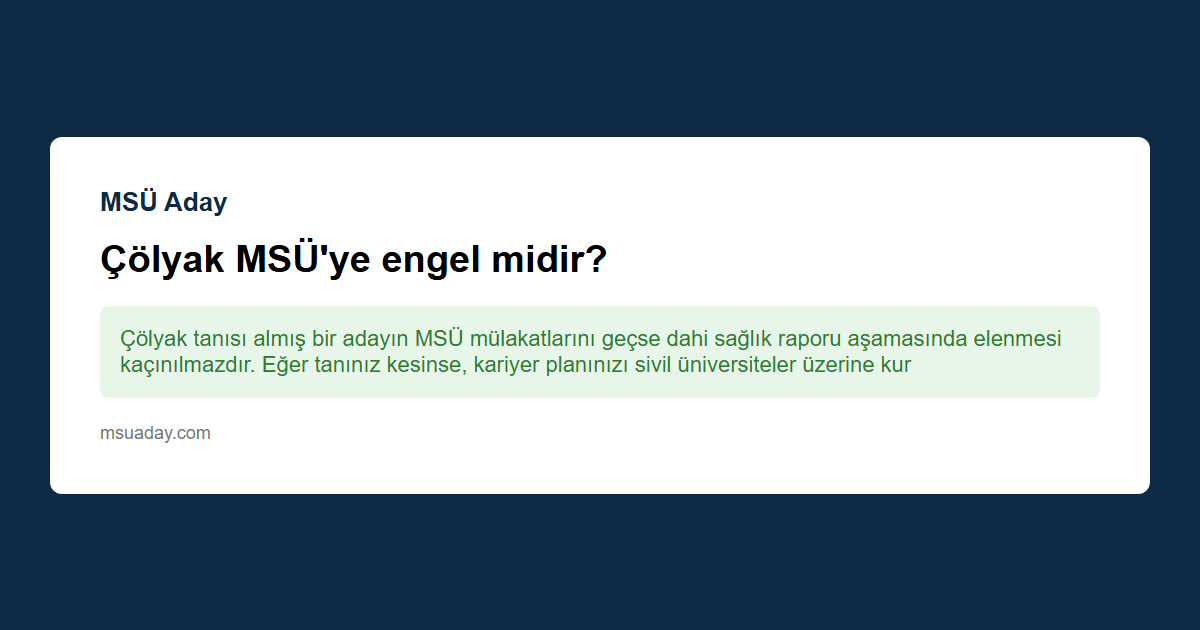 Kısa cevap: Çölyak tanısı almış bir adayın MSÜ mülakatlarını geçse dahi sağlık raporu aşamasında elenmesi kaçınılmazdır. Eğer tanınız kesinse, kariyer planınızı sivil üniversiteler üzerine kurmanız daha gerçekçi olacaktır.