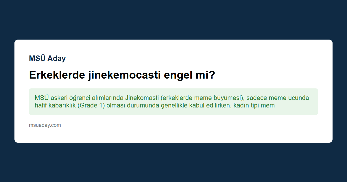 Kısa cevap: MSÜ askeri öğrenci alımlarında Jinekomasti (erkeklerde meme büyümesi); sadece meme ucunda hafif kabarıklık (Grade 1) olması durumunda genellikle kabul edilirken, kadın tipi meme görünümü (Grade 2 ve 3) veya sarkma olması durumunda üniforma nizamını bozduğu gerekçesiyle kesin elenme sebebidir.