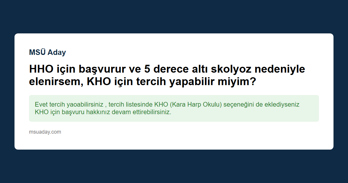 HHO (Hava Harp Okulu) başvurusu yapıp 5 derece altı skolyoz nedeniyle elenildiğinizde, tercih listesinde KHO (Kara Harp Okulu) seçeneğini de eklediyseniz KHO için başvuru hakkınız devam eder.