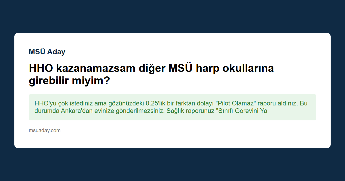 Kısa cevap: HHO'yu çok istediniz ama gözünüzdeki 0.25'lik bir farktan dolayı "Pilot Olamaz" raporu aldınız. Bu durumda Ankara'dan evinize gönderilmezsiniz. Sağlık raporunuz "Sınıfı Görevini Yapar" şeklinde onaylanırsa, Kara Harp Okulu veya Deniz Harp Okulu sıralamasına girer, asil listedeyseniz o okullara kayıt yaptırabilirsiniz.