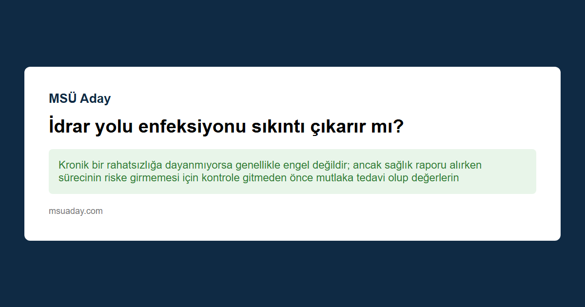 Askeri öğrenci adaylığı sağlık raporu sürecinde en sık karşılaşılan ama genellikle çözülebilen durumlardan biri idrar yolu enfeksiyonudur. Durumun engel olup olmadığı, enfeksiyonun geçici (akut) mi yoksa kronik (kalıcı) mi olduğuna göre değişir.