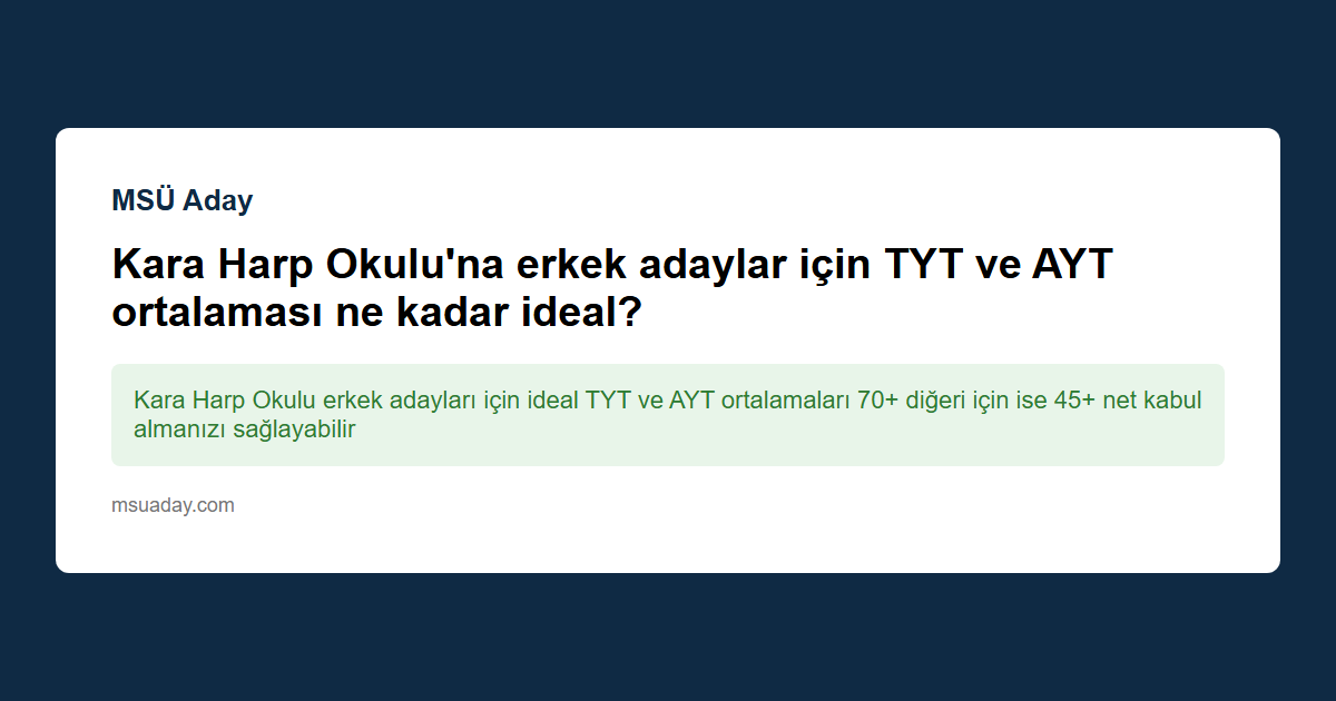 İdeal Ortalama Hedefi: Kara Harp Okulu (KHO) erkek adayları için, TYT ve AYT ortalamalarının her biri en az 70–90 arasında tutulması önerilir. Bu seviyede bir ortalama, adayın MSÜ Sınavının ADP (Aday Değerlendirme Puanı) hesaplamasında avantajlı konuma gelmesini sağlar.