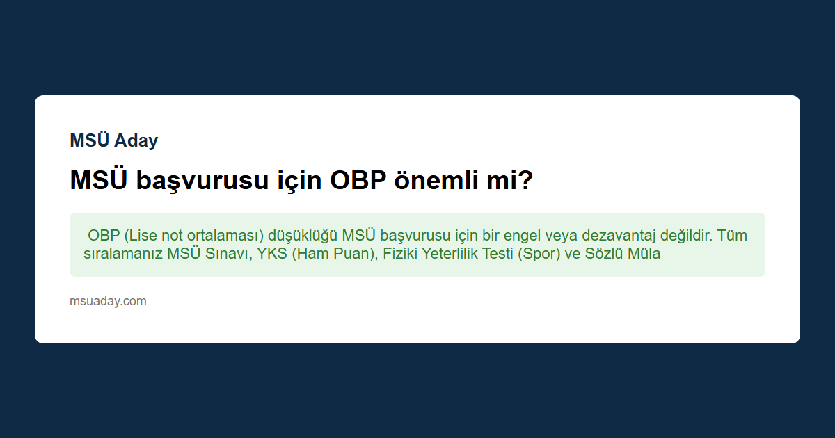 OBP (Lise not ortalaması) düşüklüğü MSÜ başvurusu için bir engel veya dezavantaj değildir. Tüm sıralamanız MSÜ Sınavı, YKS (Ham Puan), Fiziki Yeterlilik Testi (Spor) ve Sözlü Mülakat performansınıza göre belirlenir.