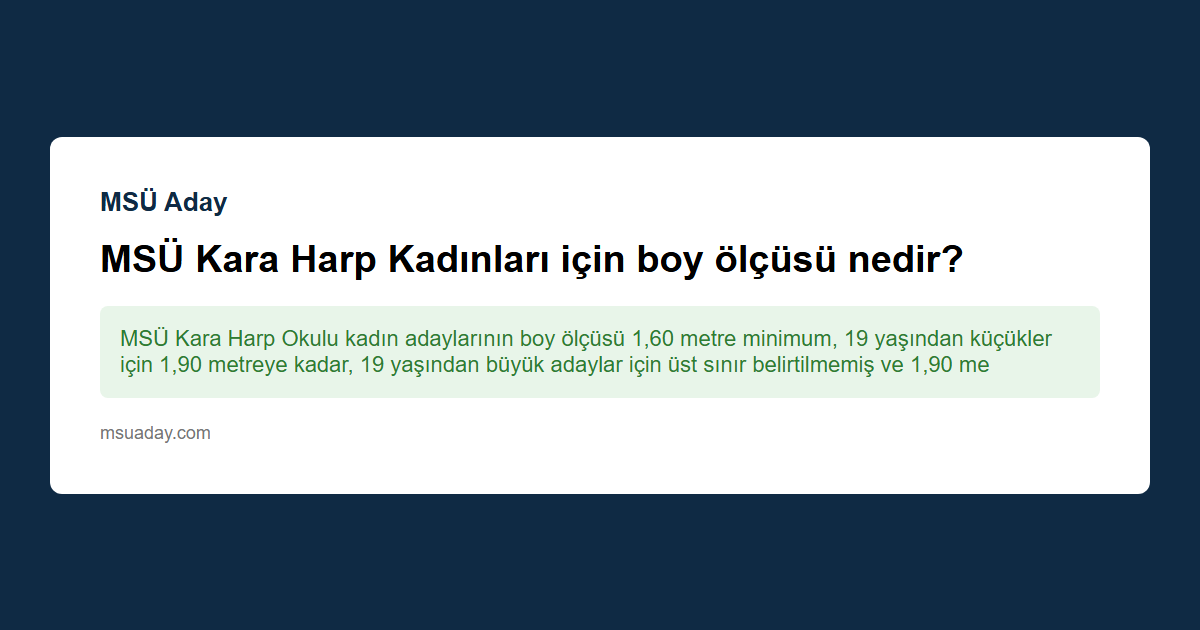 Kısa cevap: MSÜ Kara Harp Okulu kadın adaylarının boy ölçüsü 1,60 metre minimum, 19 yaşından küçükler için 1,90 metreye kadar, 19 yaşından büyük adaylar için üst sınır belirtilmemiş ve 1,90 metreyi aşabilir.