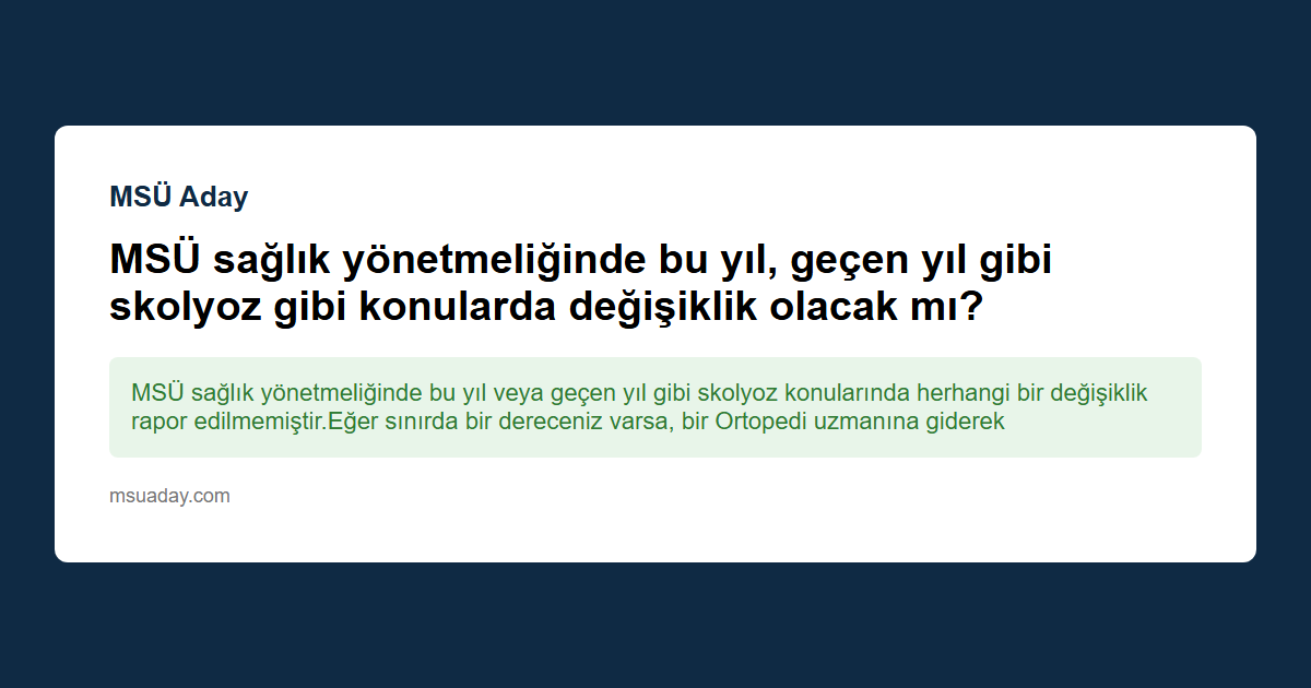 Kısa cevap: MSÜ sağlık yönetmeliğinde bu yıl veya geçen yıl gibi skolyoz konularında herhangi bir değişiklik rapor edilmemiştir.Eğer sınırda bir dereceniz varsa, bir Ortopedi uzmanına giderek ayakta çekilen tam omurga röntgeni (Skolyoz Grafisi) ile Cobb açınızı şimdiden ölçtürmeniz faydalı olacaktır.
