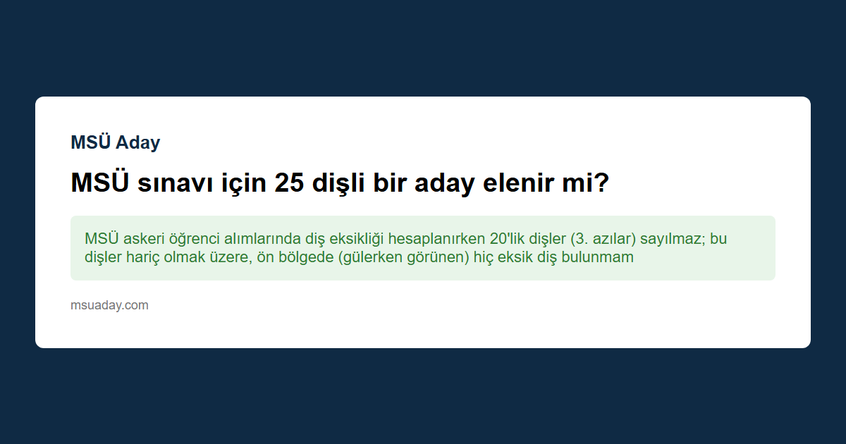 Kısa cevap: MSÜ askeri öğrenci alımlarında diş eksikliği hesaplanırken 20'lik dişler (3. azılar) sayılmaz; bu dişler hariç olmak üzere, ön bölgede (gülerken görünen) hiç eksik diş bulunmamalıdır, arka bölgede ise çiğneme fonksiyonunu bozmayacak şekilde en fazla 4-5 diş eksikliği (veya implant/köprü ile tedavisi) kabul edilebilir.