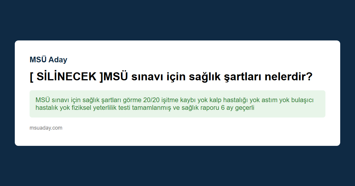 Kısa cevap: MSÜ sınavı için sağlık şartları görme 20/20 işitme kaybı yok kalp hastalığı yok astım yok bulaşıcı hastalık yok fiziksel yeterlilik testi tamamlanmış ve sağlık raporu 6 ay geçerli olmalı.