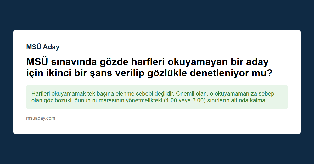 Kısa cevap: Harfleri okuyamamak tek başına elenme sebebi değildir. Önemli olan, o okuyamamanıza sebep olan göz bozukluğunun numarasının yönetmelikteki (1.00 veya 3.00) sınırların altında kalmasıdır. Altındaysa geçersiniz, üstündeyse gözlükle görseniz bile elenirsiniz.