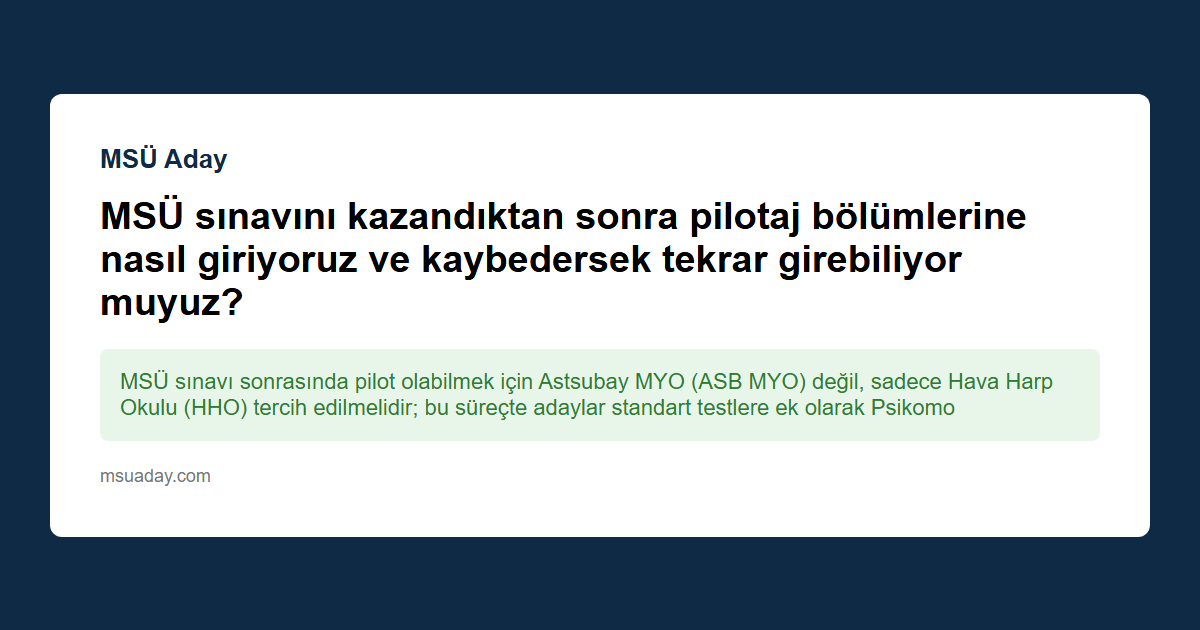 Kısa cevap: MSÜ sınavı sonrasında pilot olabilmek için Astsubay MYO (ASB MYO) değil, sadece Hava Harp Okulu (HHO) tercih edilmelidir; bu süreçte adaylar standart testlere ek olarak Psikomotor Testi ve Öğrenci Seçme Uçuşu (ÖSU) aşamalarından geçmek zorundadır. ASB MYO mezunları uçak bakım personeli olur, pilot olamazlar.