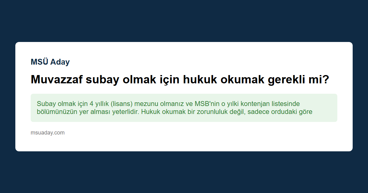 Kısa cevap: Subay olmak için 4 yıllık (lisans) mezunu olmanız ve MSB'nin o yılki kontenjan listesinde bölümünüzün yer alması yeterlidir. Hukuk okumak bir zorunluluk değil, sadece ordudaki görev sınıfınızı (Hukuk Şubesi) belirleyen bir seçenektir.