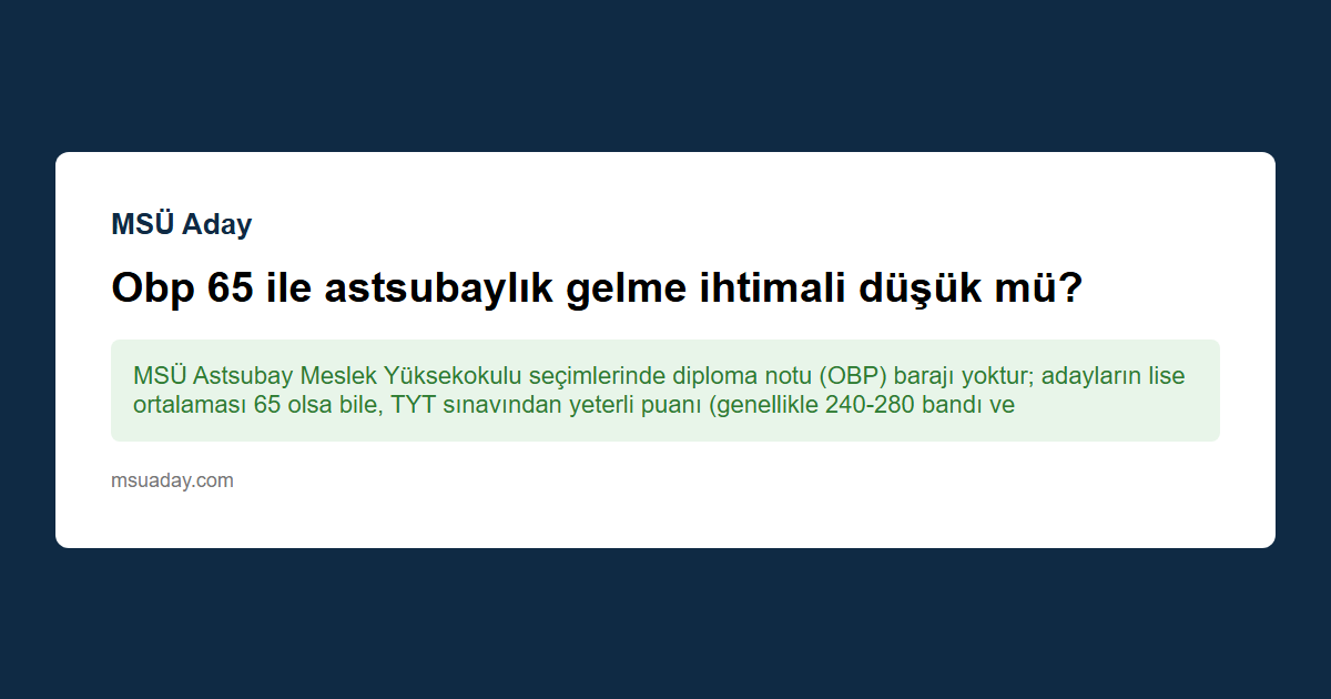Kısa cevap: MSÜ Astsubay Meslek Yüksekokulu seçimlerinde diploma notu (OBP) barajı yoktur; adayların lise ortalaması 65 olsa bile, TYT sınavından yeterli puanı (genellikle 240-280 bandı ve üzeri) aldıkları takdirde kazanma şansları yüksektir. MSÜ Aday Değerlendirme Puanı (ADP) hesaplanırken okul puanı (OBP) eklenmez, TYT Ham Puanı esas alınır.