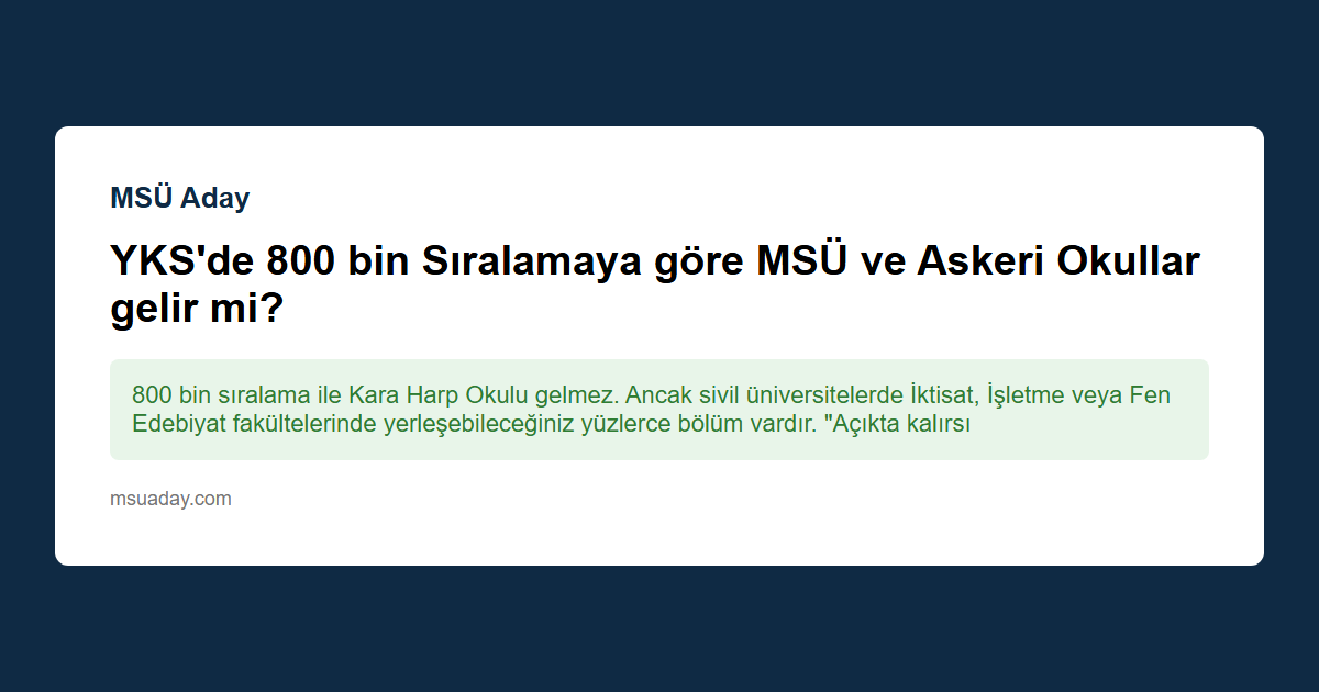 Kısa cevap: 800 bin sıralama ile Kara Harp Okulu gelmez. Ancak sivil üniversitelerde İktisat, İşletme veya Fen Edebiyat fakültelerinde yerleşebileceğiniz yüzlerce bölüm vardır. "Açıkta kalırsınız" diye bir durum söz konusu değildir.