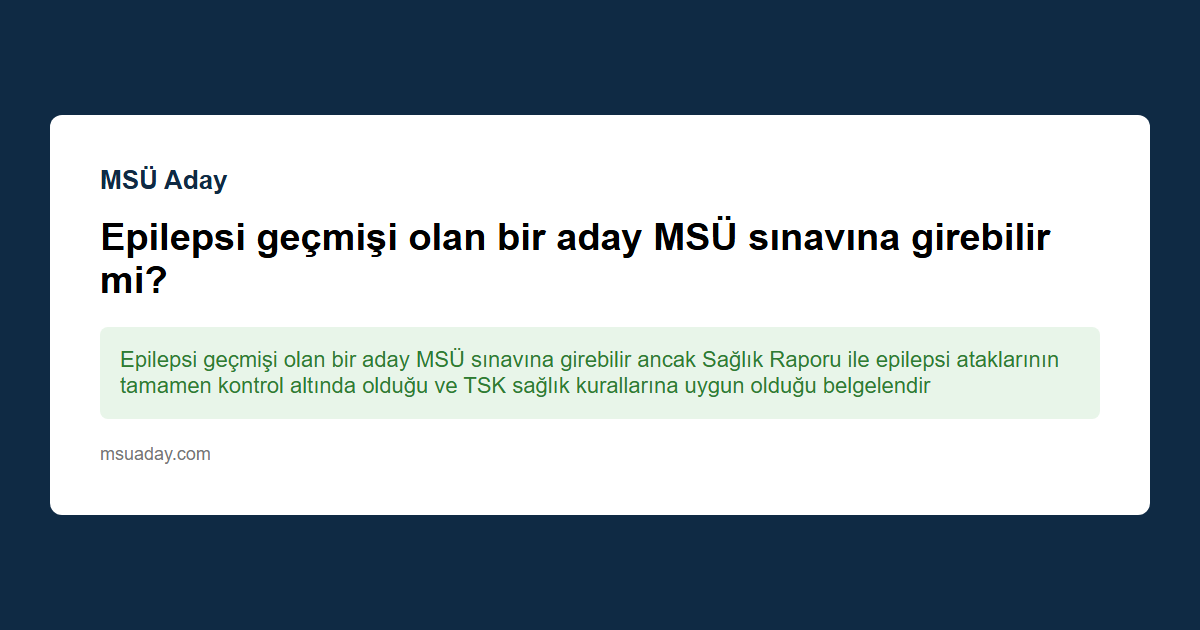 Kısa cevap: Epilepsi geçmişi olan bir aday MSÜ sınavına girebilir ancak Sağlık Raporu ile epilepsi ataklarının tamamen kontrol altında olduğu ve TSK sağlık kurallarına uygun olduğu belgelendirilmeli MSÜ sınavına katılım sağlanır.