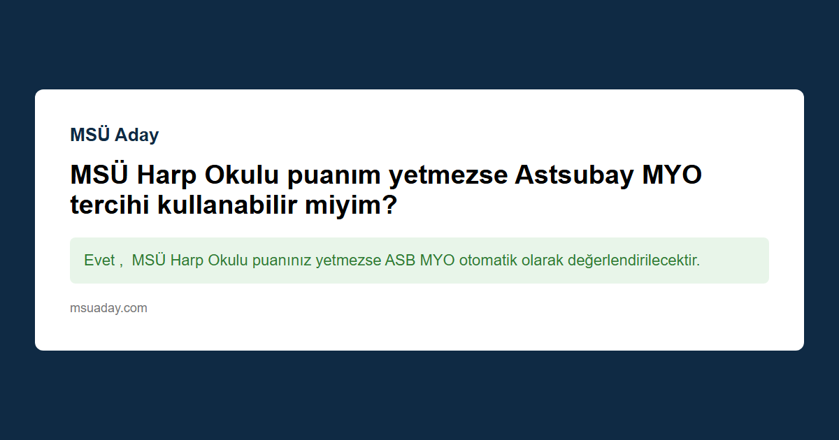 Sonuç olarak, MSÜ Harp Okulu puanınız yetmezse ve başvurunuzda ASB MYO tercihi de yer alıyorsa, bu tercihi otomatik olarak kullanabilirsiniz. Aksi takdirde, ASB MYO’nu ayrı bir başvuru olarak yeniden yapmanız gerekir.