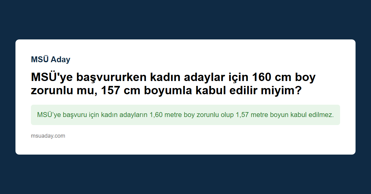 Kısa cevap: MSÜ’ye başvuru için kadın adayların 1,60 metre boy zorunlu olup 1,57 metre boyun kabul edilmez.